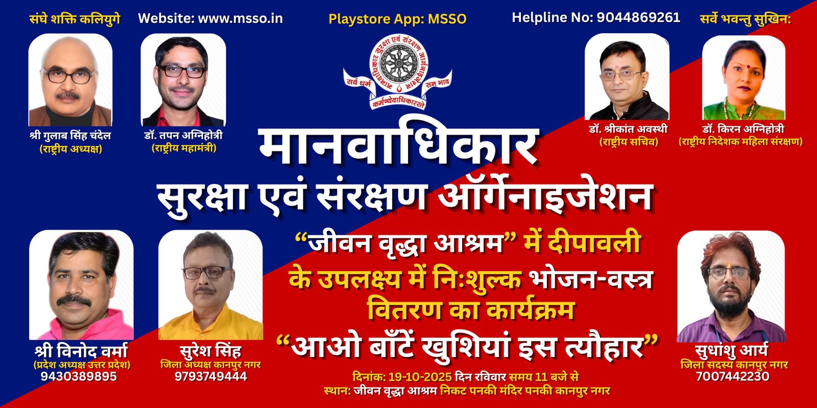 मानवाधिकार सुरक्षा एवं संरक्षण ऑर्गेनाइजेशन के द्वारा प्रत्येक रविवार को जनसुनवाई का आयोजन किया जाता है जिसमें आपकी समस्याओं का निशुल्क समाधान किया जाएगा।