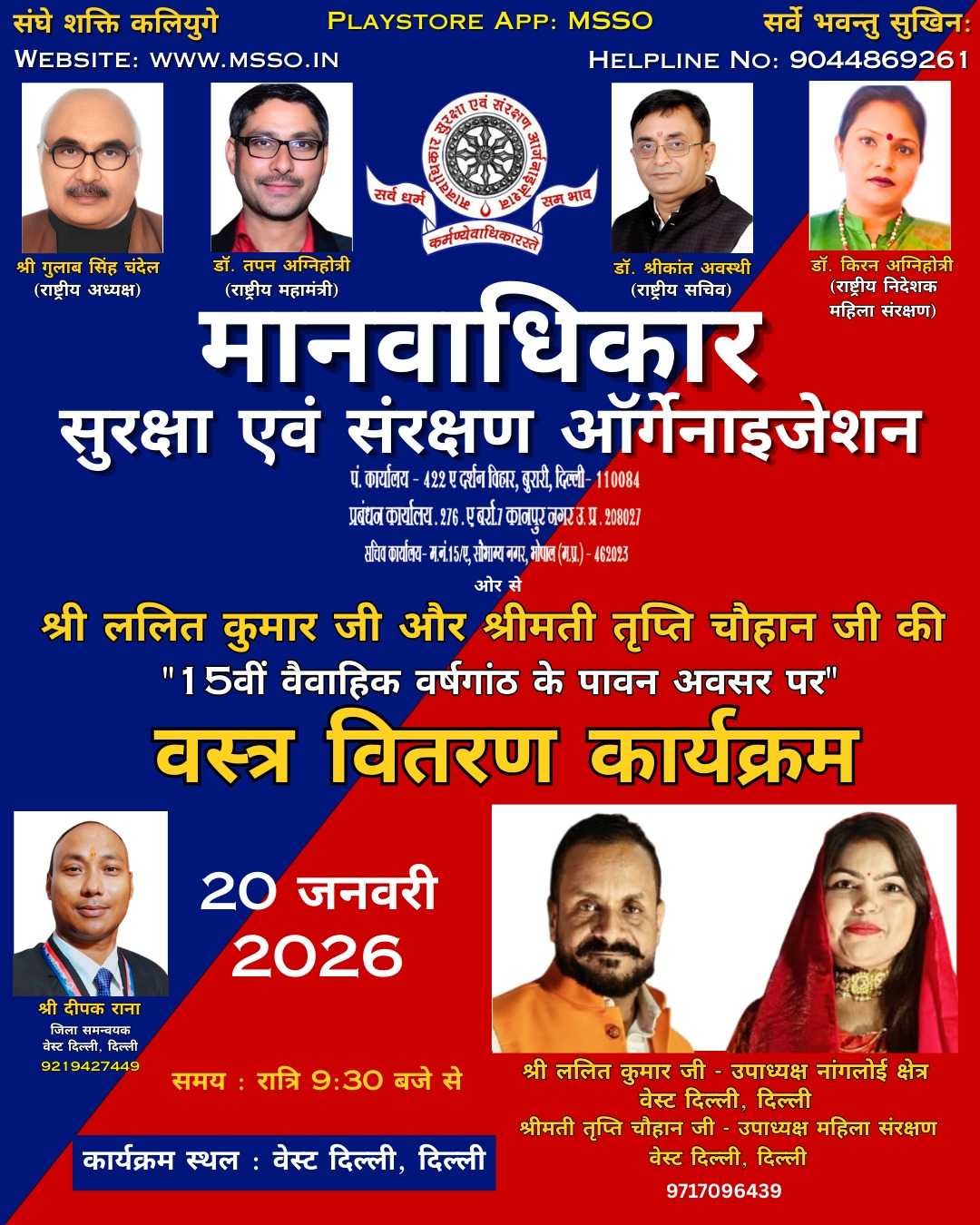 15वीं वैवाहिक वर्षगांठ: वस्त्र वितरण का आयोजन! श्रीमती तृप्ति चौहान जी (उपाध्यक्ष, महिला संरक्षण, वेस्ट दिल्ली) और श्री ललित कुमार जी (उपाध्यक्ष, नांगलोई क्षेत्र, वेस्ट दिल्ली) स्थल: वेस्ट दिल्ली, दिल्ली दिनांक: 20 जनवरी 2026 समय: रात्रि 9:30 बजे से