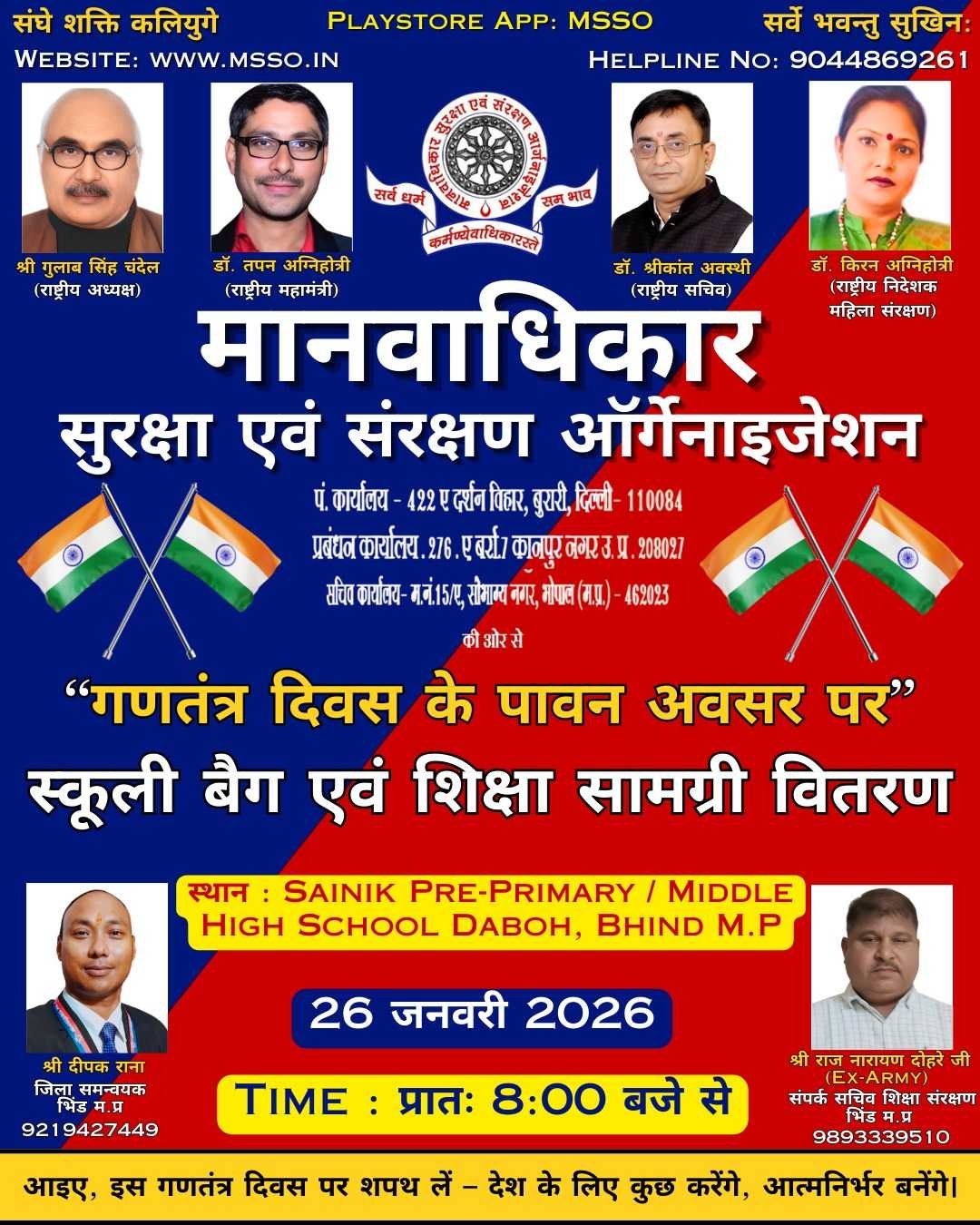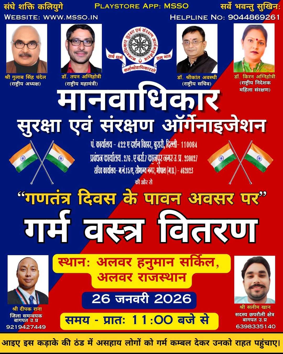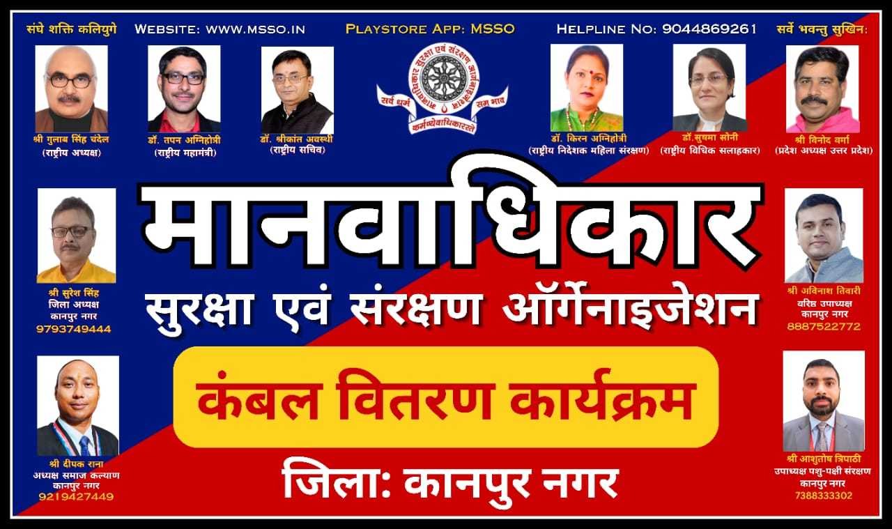 मानवाधिकार सुरक्षा एवं संरक्षण संगठन (MSSO) सर्दी की कड़ाके की ठंड में असहायों के चेहरे पर मुस्कान लाने के लिए तैयार है। 14 जनवरी 2026 को सांगानेर, जयपुर में होने वाले कंबल वितरण कार्यक्रम में हम गरीबों, बेघरों और जरूरतमंद परिवारों को दिए जायेंगे।
