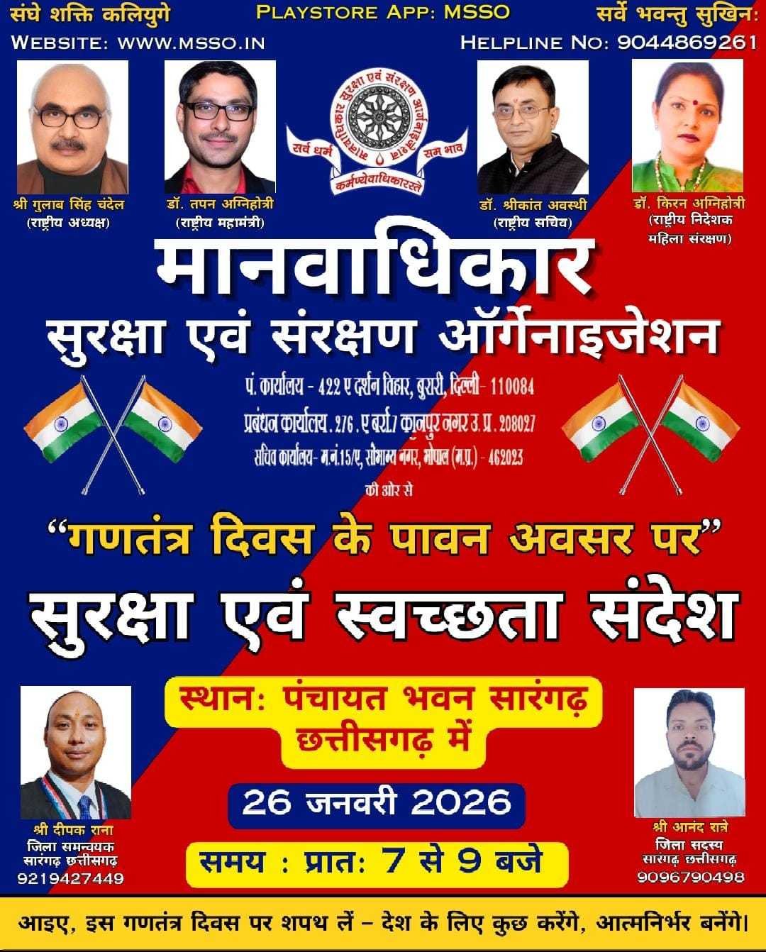 नाम - श्री आनंद रात्रे जिला सदस्य, सारंगढ़ छत्तीसगढ़ 26 जनवरी 2026 स्थान: पंचायत भवन सारंगढ़ छत्तीसगढ़ में समय : प्रात: 7 से 9 बजे