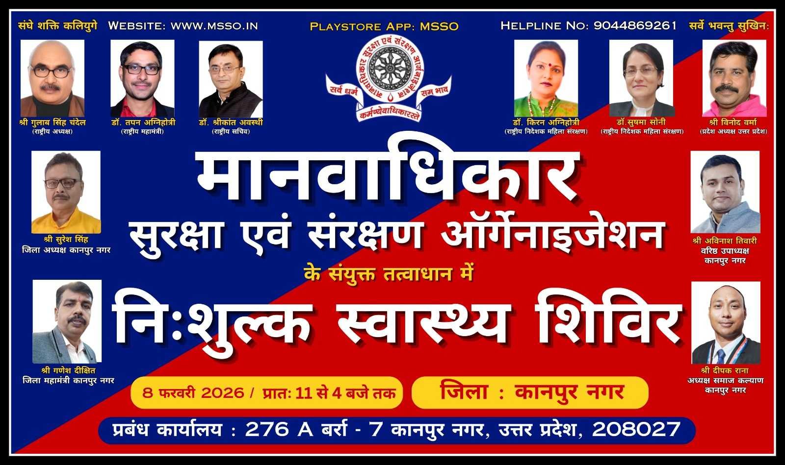 मानवाधिकार सुरक्षा एवं संरक्षण ऑर्गेनाइजेशन (MSSO) द्वारा "मानवता का स्वास्थ्य केंद्र" के अंतर्गत एक भव्य निःशुल्क स्वास्थ्य शिविर का आयोजन किया जा रहा है। गरीब, असहाय और जरूरतमंद भाइयों-बहनों के स्वास्थ्य की चिंता हमारी प्राथमिकता है!