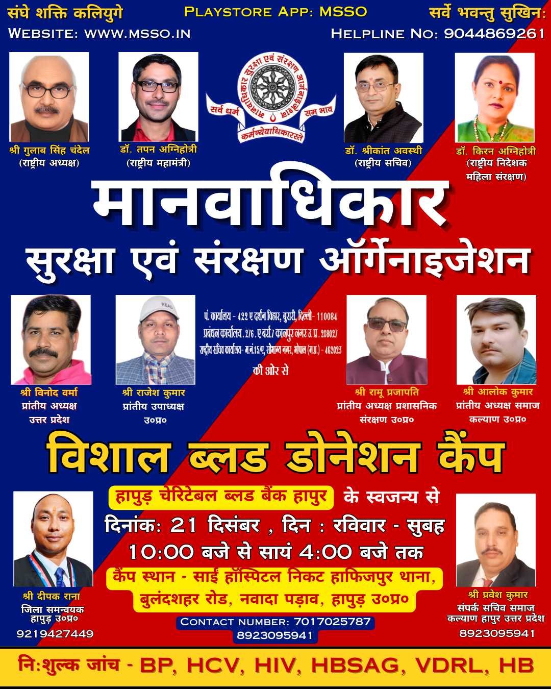 मानवाधिकार सुरक्षा एवं संरक्षण ऑर्गेनाइजेशन (MSSO) द्वारा "मानवता का स्वास्थ्य केंद्र" के अंतर्गत एक भव्य निःशुल्क स्वास्थ्य शिविर का आयोजन किया जा रहा है। गरीब, असहाय और जरूरतमंद भाइयों-बहनों के स्वास्थ्य की चिंता हमारी प्राथमिकता है!