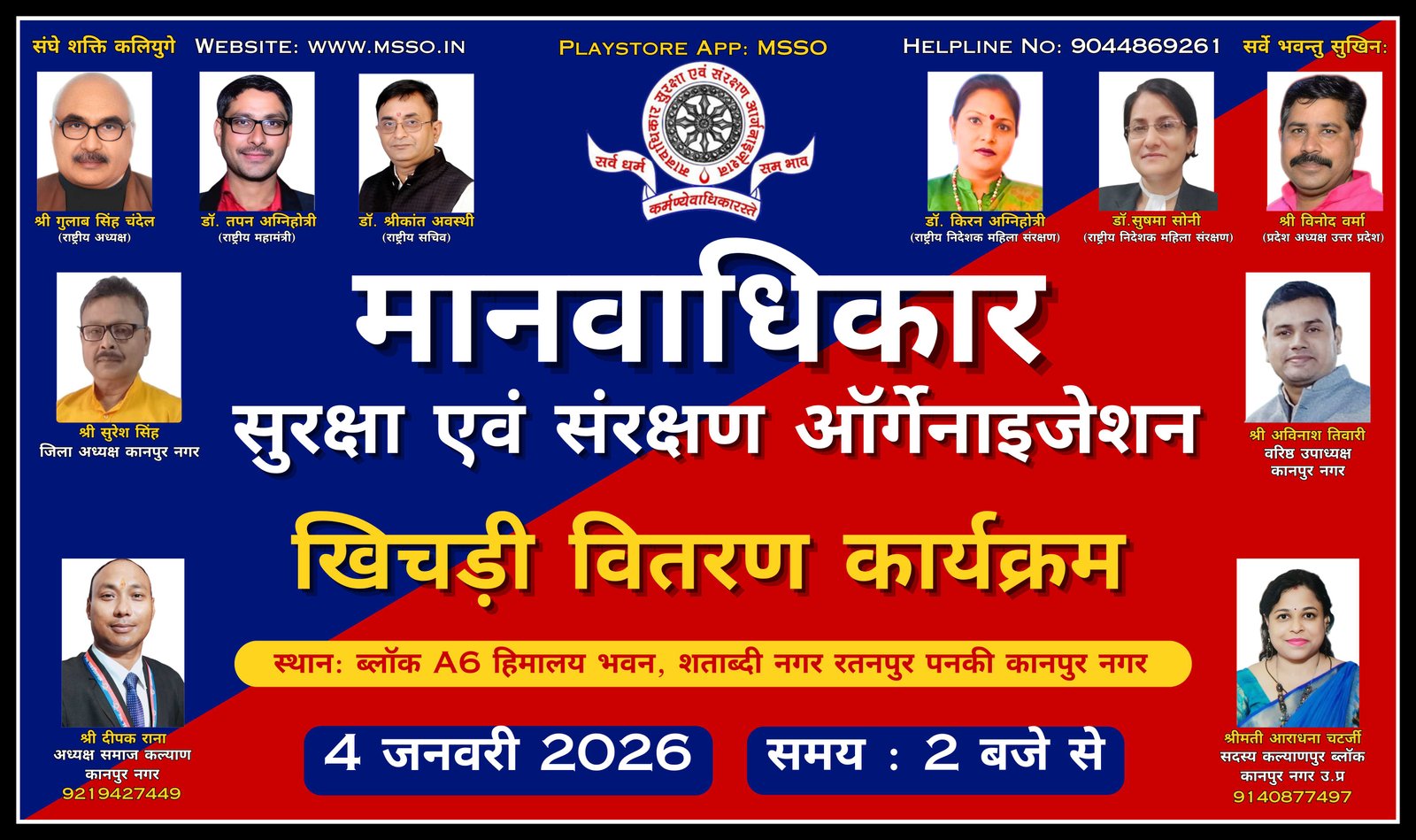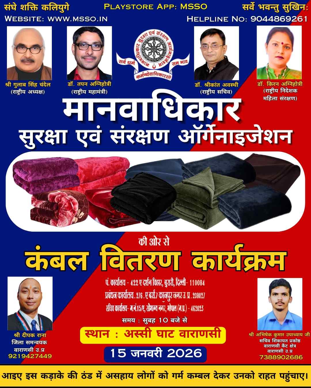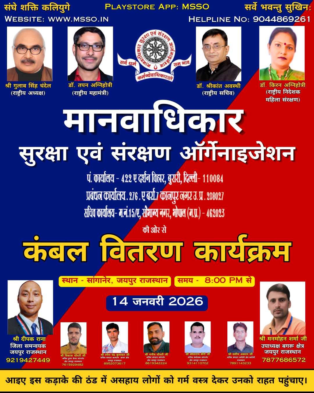मानवाधिकार सुरक्षा एवं संरक्षण संगठन (MSSO) सर्दी की कड़ाके की ठंड में असहायों के चेहरे पर मुस्कान लाने के लिए तैयार है। 14 जनवरी 2026 को सांगानेर, जयपुर में होने वाले कंबल वितरण कार्यक्रम में हम गरीबों, बेघरों और जरूरतमंद परिवारों को दिए जायेंगे।